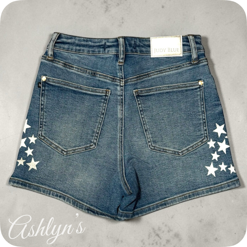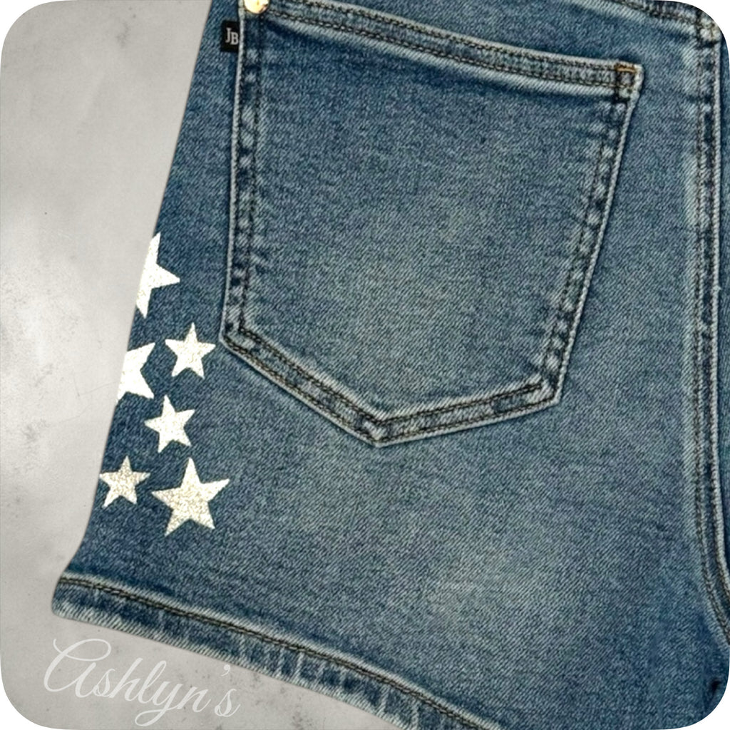 JUDY BLUE American Pride HW Silver Star Splatter Blue Denim Shorts