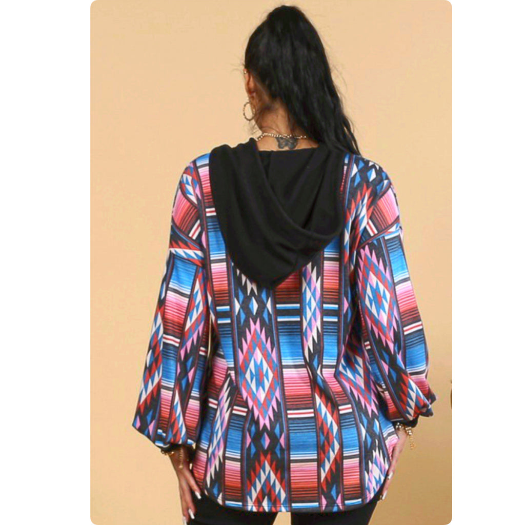 / Aztec Color Block Blue Pink Hacci Henley Hoodie