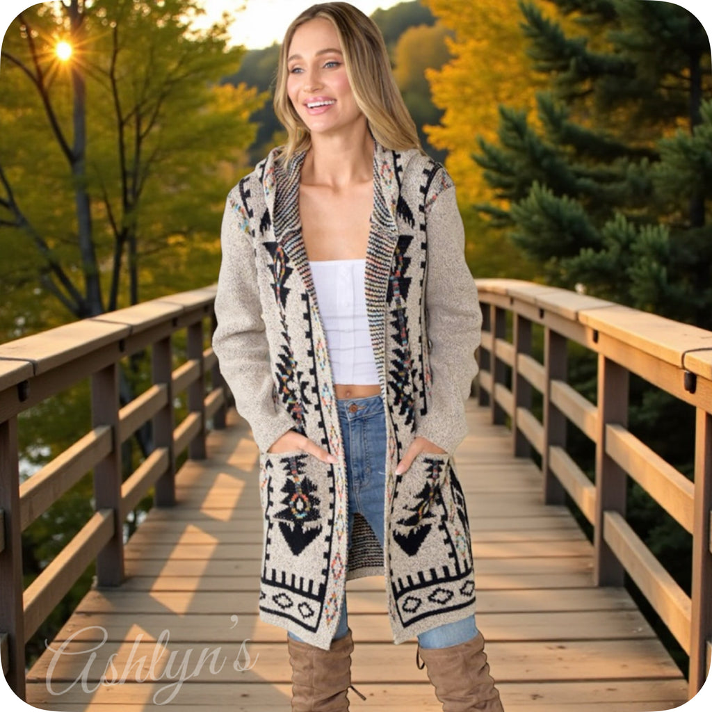 Boho Asymmetric Print Beige Hooded Cardigan-Aztec Sweater-Duster-Oatmeal