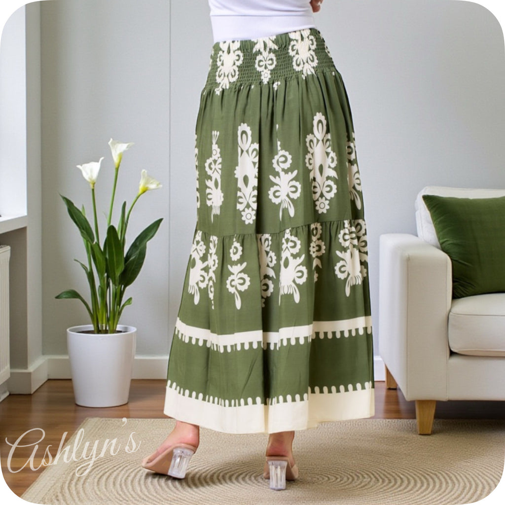 Absolutely Stunning! You’ll love our olive green and ivory boho print midi skirt with a wide banded elasticized waist and draw string.