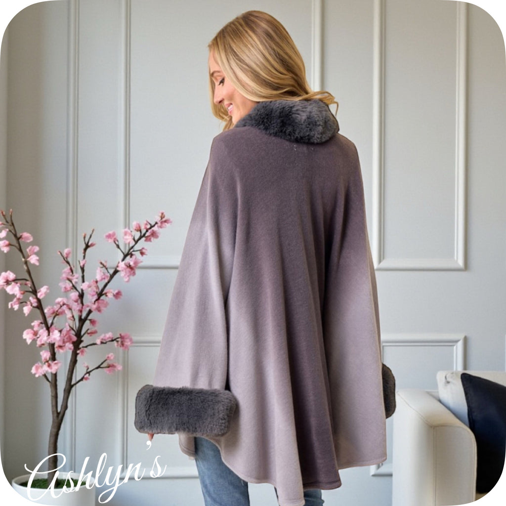 / Classy Plush Faux Fur Trim Gray Ombre Cape-Coat-Poncho-Wrap