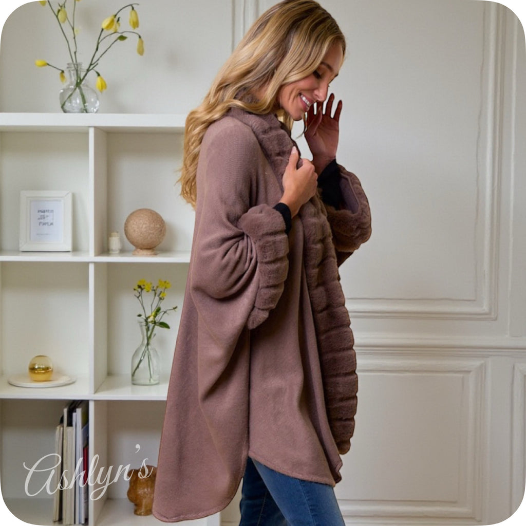 / Classy Plush Faux Fur Trim Mocha Cape-Coat-Poncho-Wrap