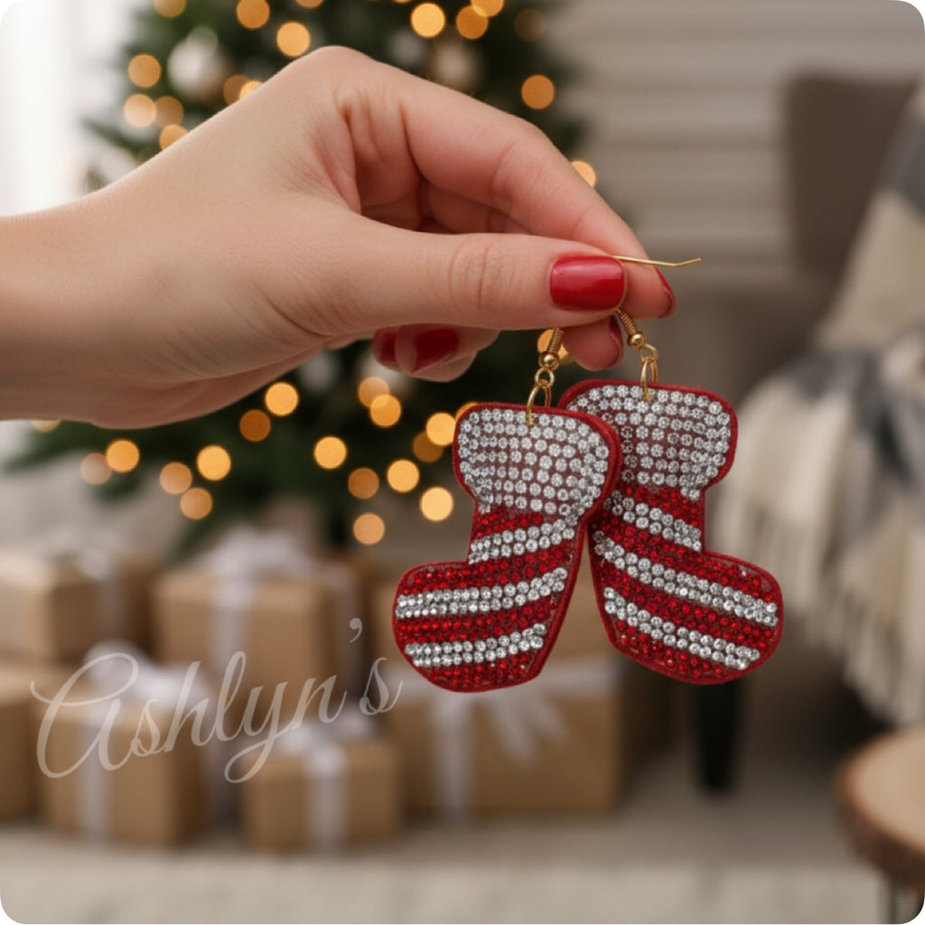 You’ll absolutely LOVE our puffy jeweled Christmas stocking dangle earrings. Definitely eye catching and a show stopper! Be prepared for the non stop “I love those, where’d you get them” question because it’s going to happen! *FEATURES: jeweled puffy stocking-fish hook dangle