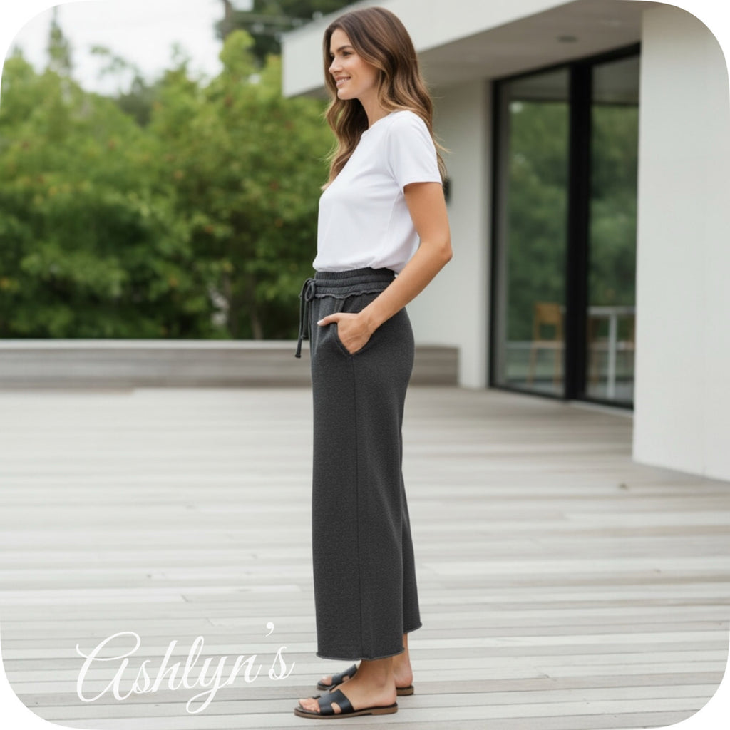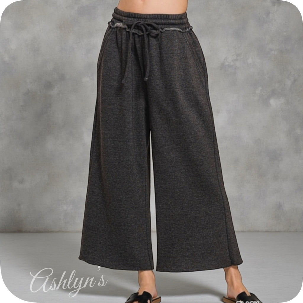 Features: acid wash fleece palazzo sweatpants, thick firm elasticized waistline with tie string ability, side pockets and raw hem