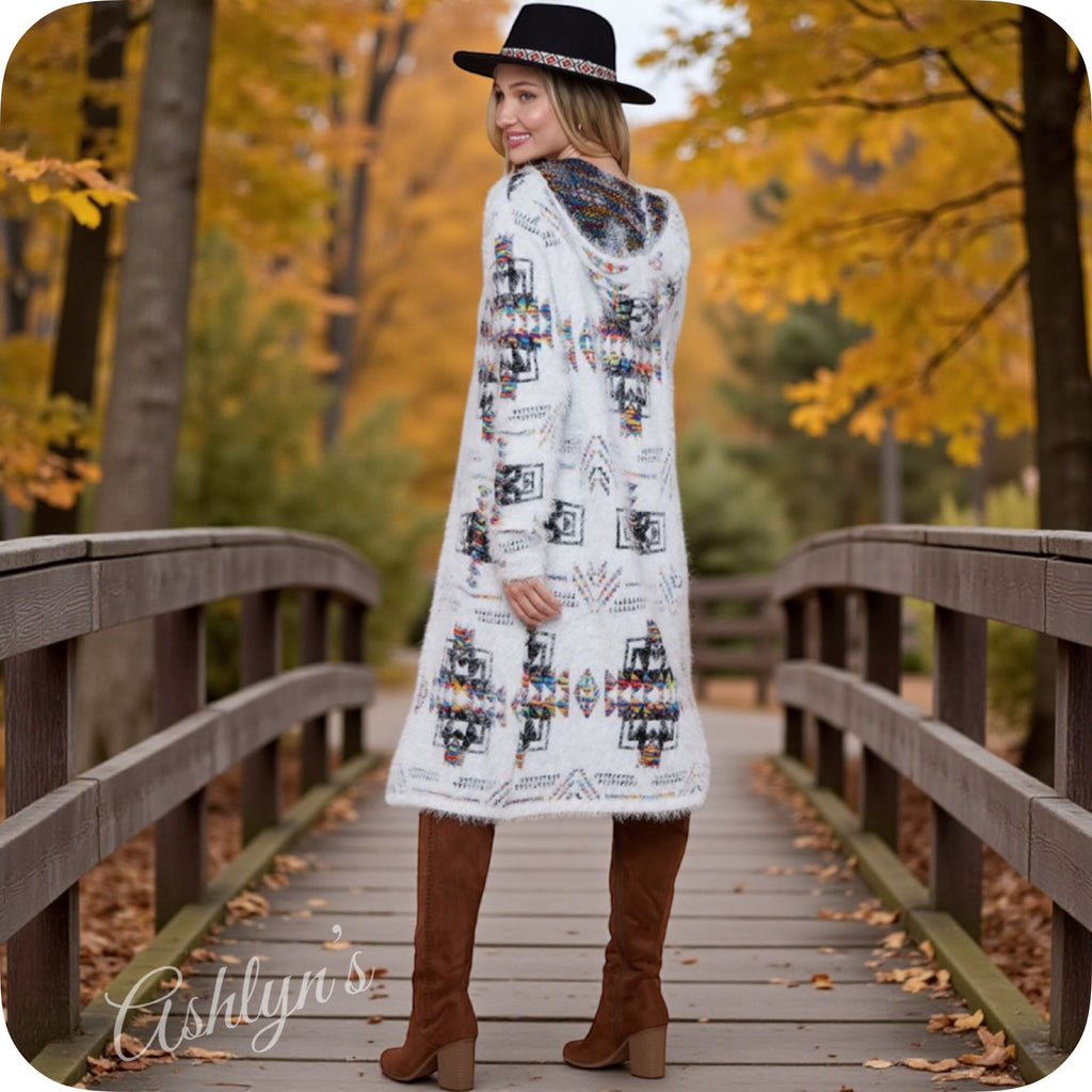 / Fuzzy Ivory Aztec Multi Color Detail Hooded Cardigan-Sweater Duster