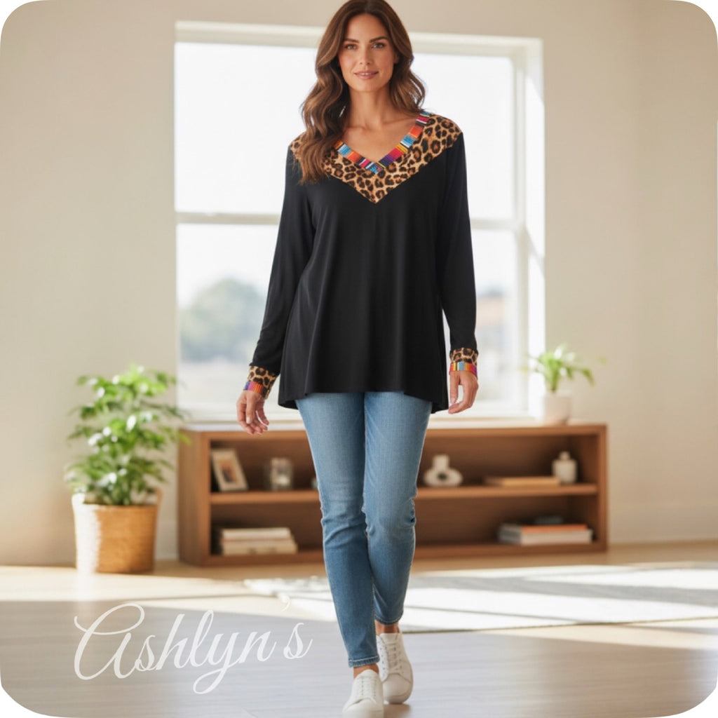 / Casually Classy Animal-Serape Print V Neck Long Sleeve Black Top