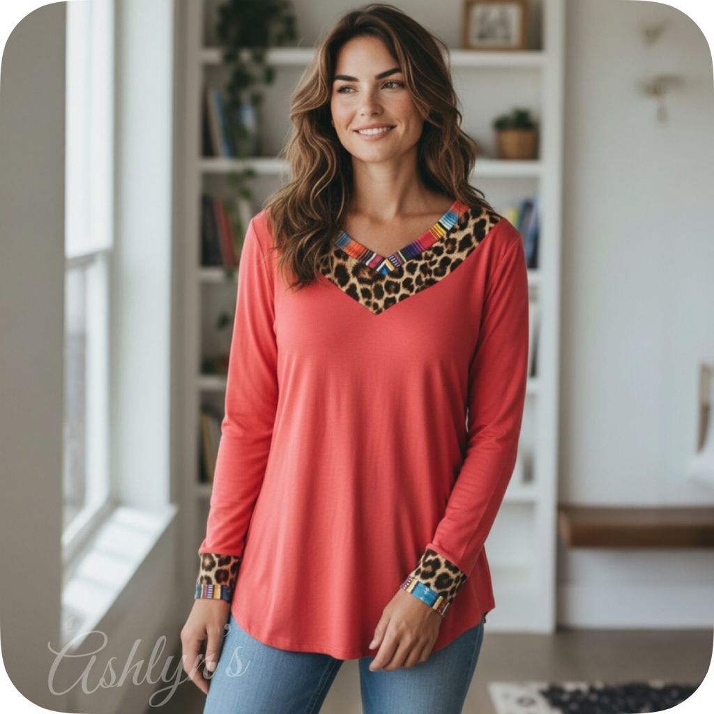 / Casually Classy Animal-Serape Print V Neck Long Sleeve Coral Top